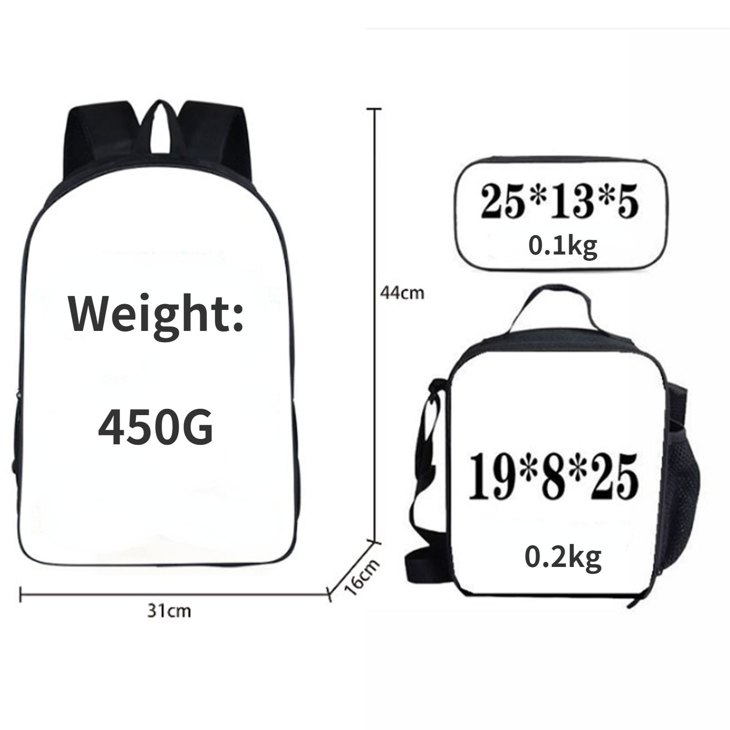 סט 3 חלקים הכולל : תיק בי"ס , תיק אוכל, קלמר בהדפסות מיוחדות