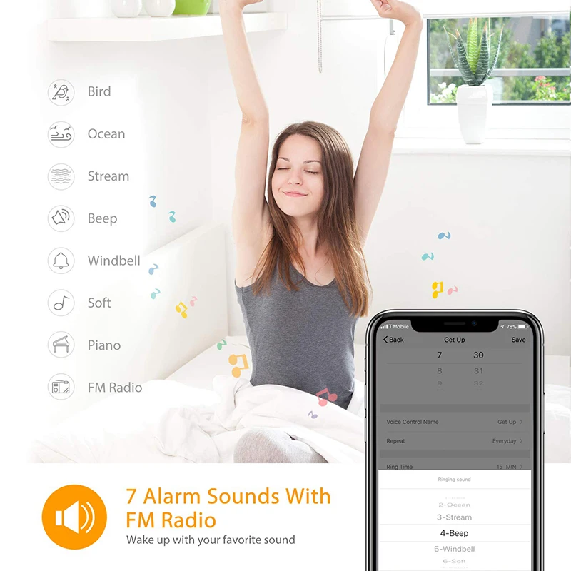 השעון מדמה זריחה טבעית ומאיר בהדרגה את החדר ב-8 צלילים טבעיים לבחירה – מושלם לילדים ולמי שמתקשה לקום בבוקר. ניתן לבחור את משך ההארה (10, 20 או 30 דקות) ולהתעורר בעדינות לאור נעים וקולות מרגיעים.