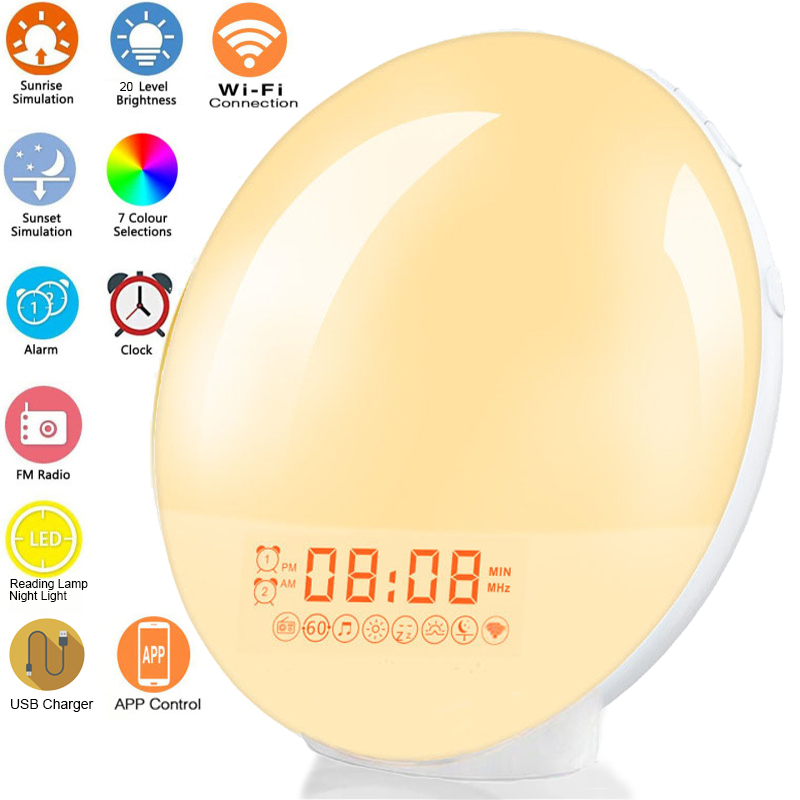 שעון מעורר זריחה חכם עם תאורה מדליקה והפעלה באפליקציה מתחבר ל WIFI, כבל טעינת USB – כולל גם רדיו FM, מאיר בצבעים שונים , מבחר צלילים נעימים ועוד הרבה אפשרויות  שעון מעורר זריחה חכם עם תאורה מדליקה והפעלה באפליקציה פירוט מפורט כאן וגם בתמונות שעון מעורר חכם עם תאורת זריחה…